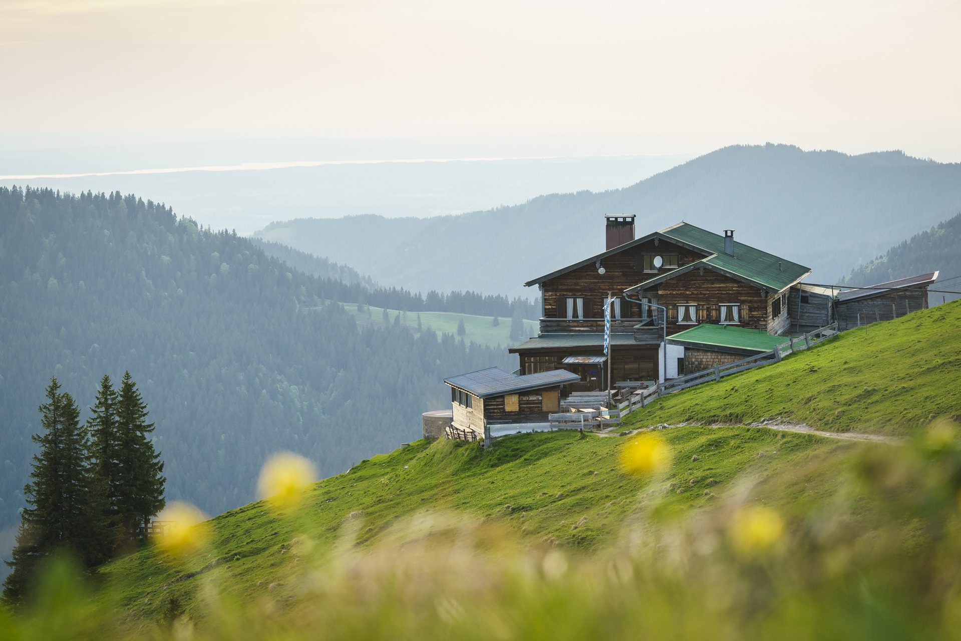 Deutschland, Bayern, Tegernsee, Kreuth, Hirschberghaus und Bergwiese kurz nach Sonnenuntergang, Europa, Engl.: Europe, Germany, Bavaria, Lake Tegernsee, Kreuth, Hirschberghaus mountain hut and mountain meadow just after sunset, leisure, travel, Alps, spring, springtime