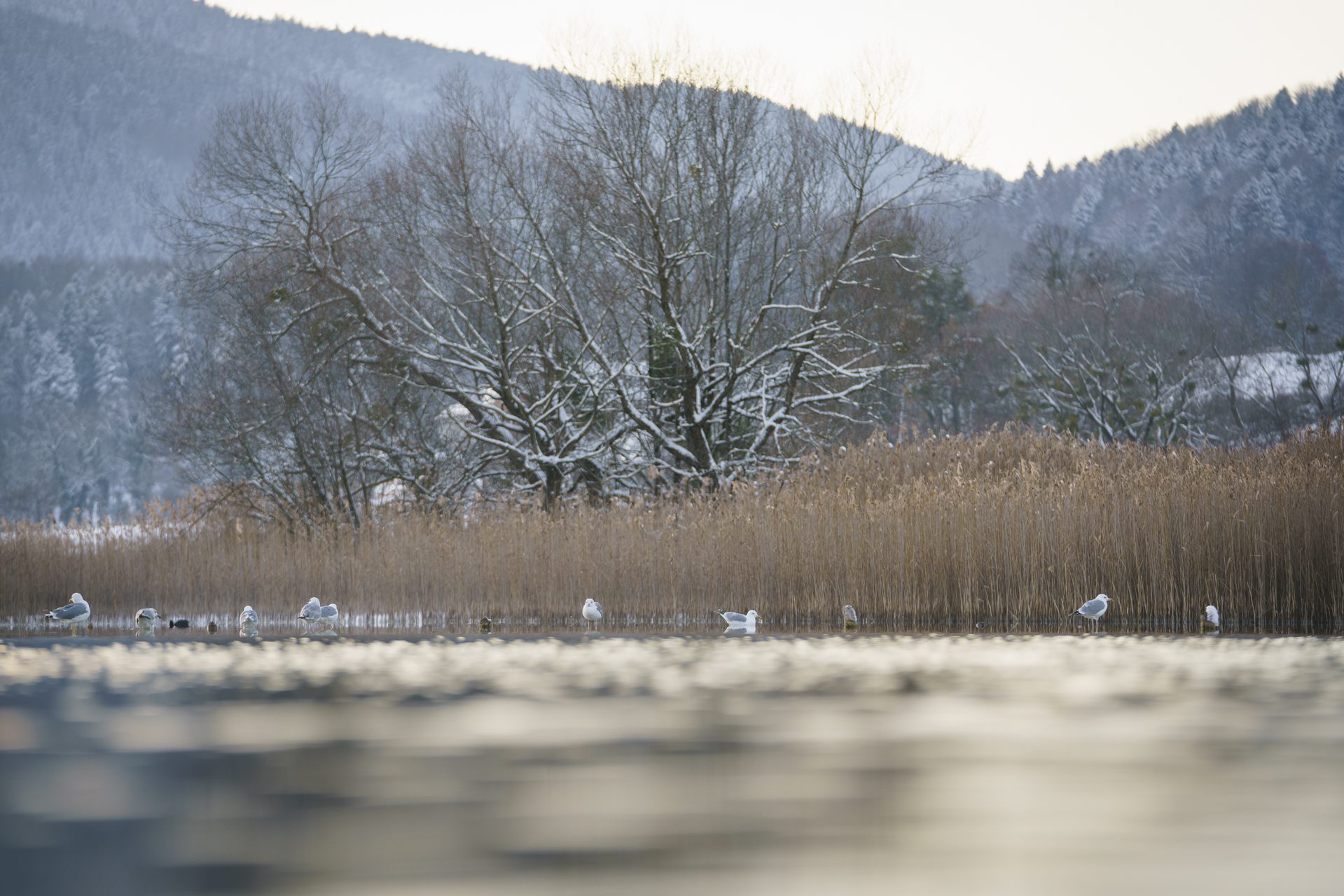 Möwen auf dünnem Eis in Gmund am Abend
